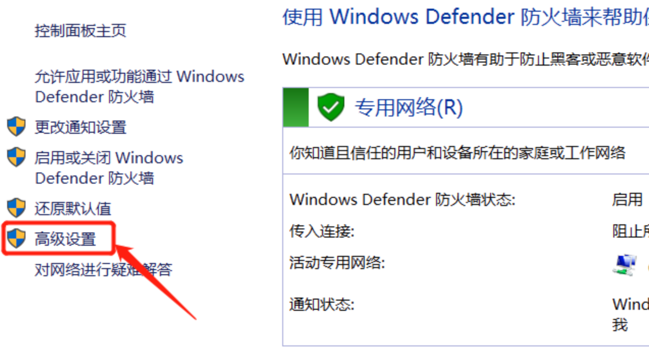 - 在控制面板中找到 Windows Defender 防火墙的设置页面,点击